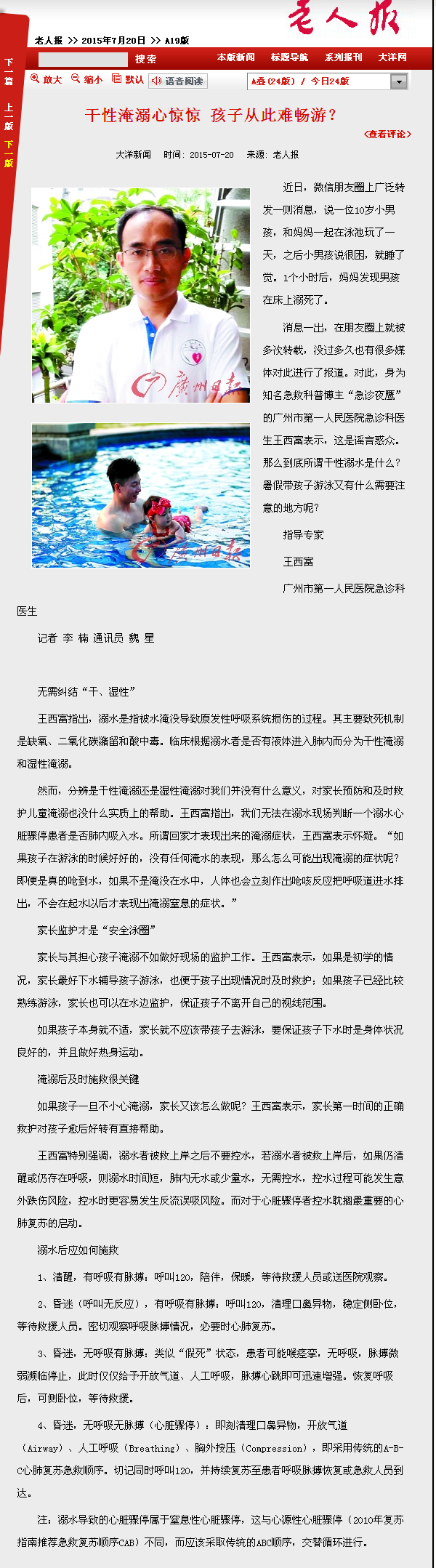 《老人报》:干性淹溺心惊惊 孩子从此难畅游?2015年7月20日A19版