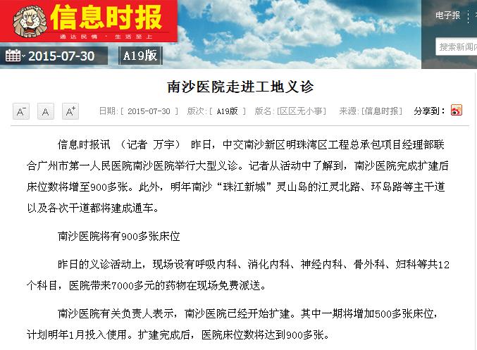 《信息时报》:南沙医院走进工地义诊 2015年7月30日A19版