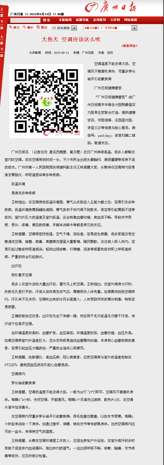 《广州日报》:大热天 空调应该这么吹 2015年8月14日B8版