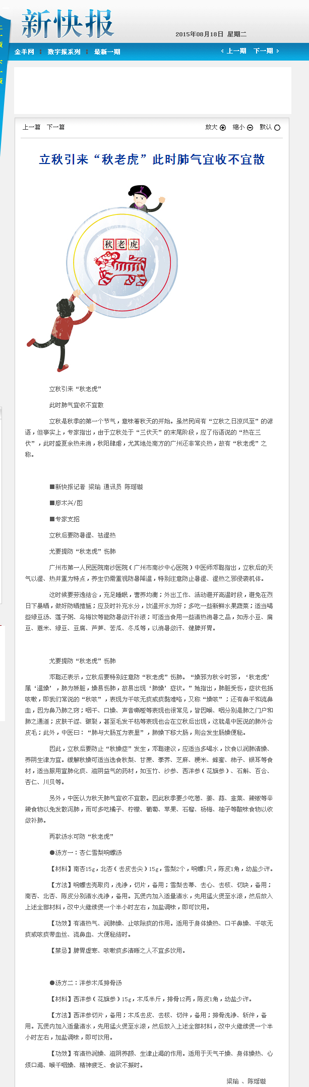 《新快报》:立秋引来“秋老虎”此时肺气宜收不宜散 2015年8月18日B02版
