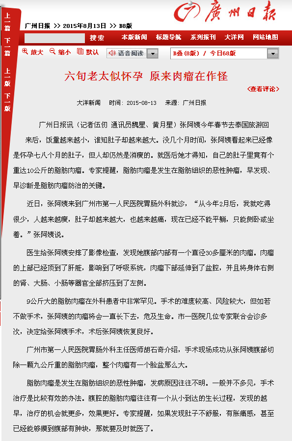 《广州日报》:六旬老太似怀孕 原来肉瘤在作怪 2015年8月13日B8版
