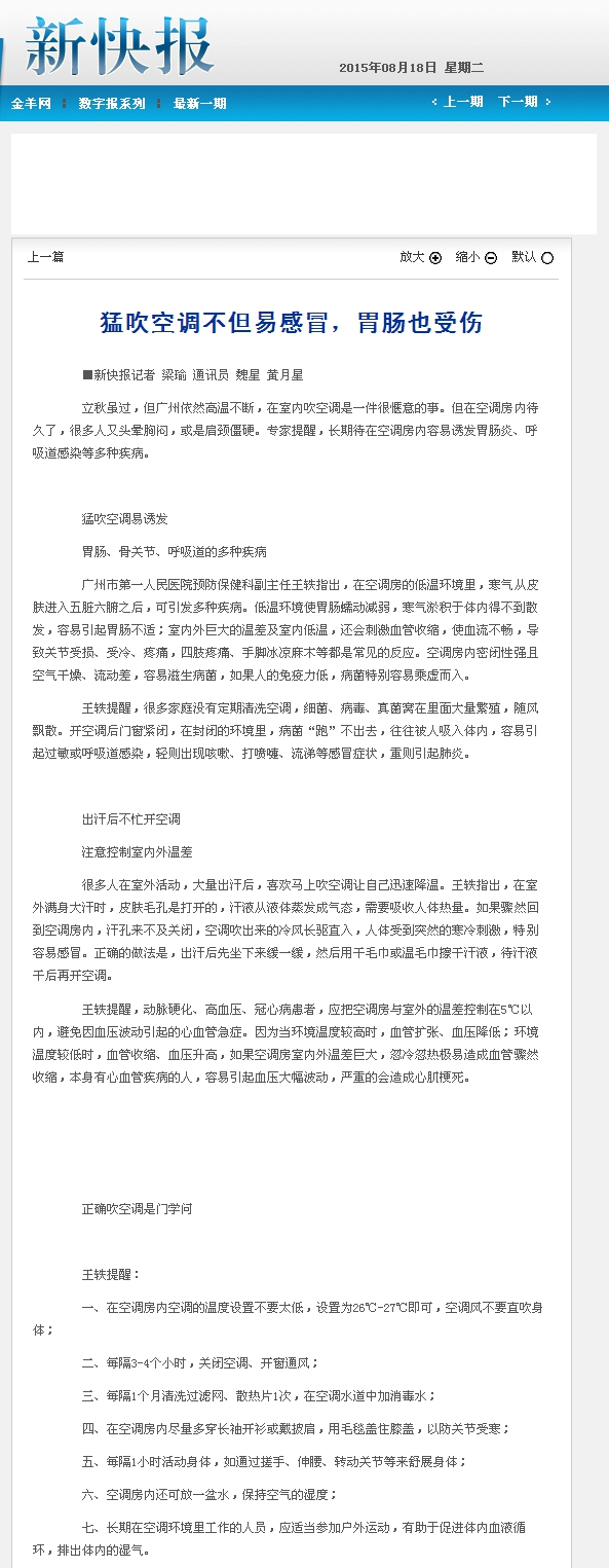 《新快报》:猛吹空调不但易感冒,胃肠也受伤 2015年8月18日B02版