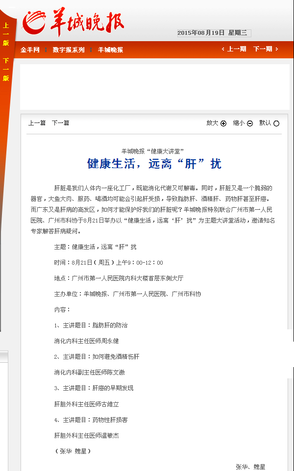 《羊城晚报》:健康生活,远离“肝”扰 2015年8月19日A20版