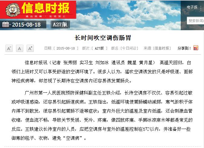 《信息时报》:长时间吹空调伤肠胃 2015年8月18日A27版