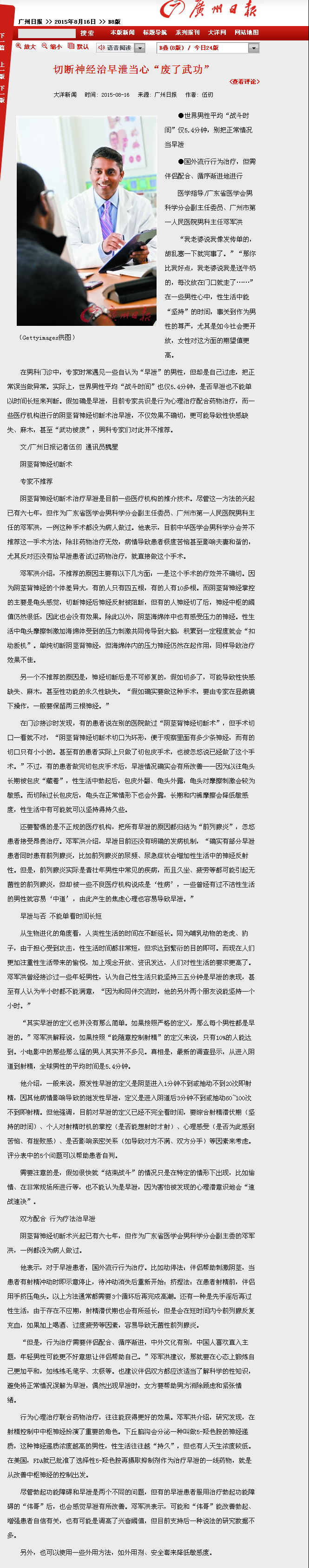 《广州日报》:切断神经治早泄当心“废了武功” 2015年8月16日B8版