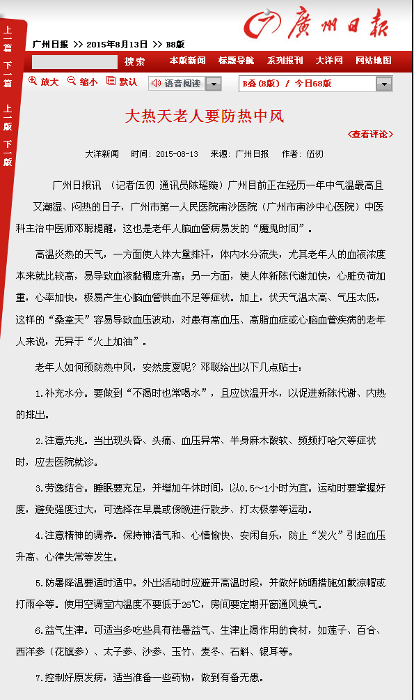 《广州日报》:大热天老人要防热中风 2015年8月13日B8版