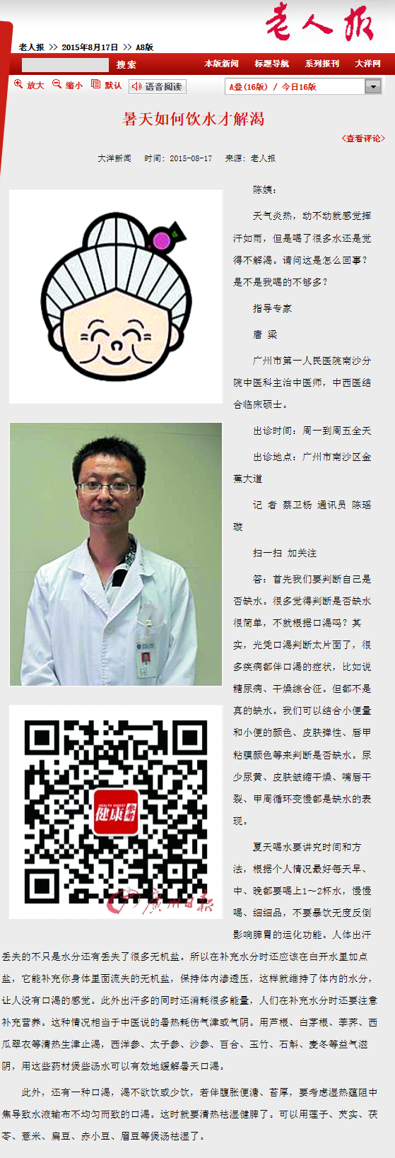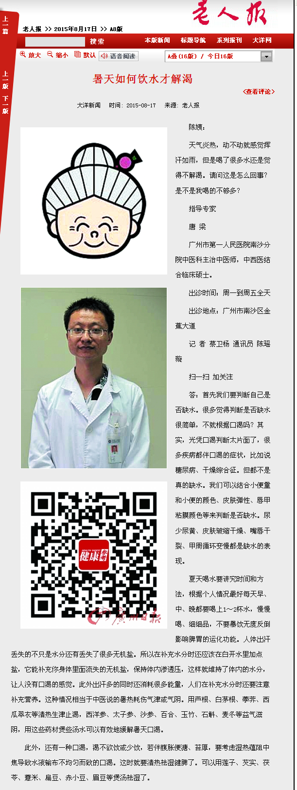 《老人报》:暑天如何饮水才解渴 2015年8月17日A8版