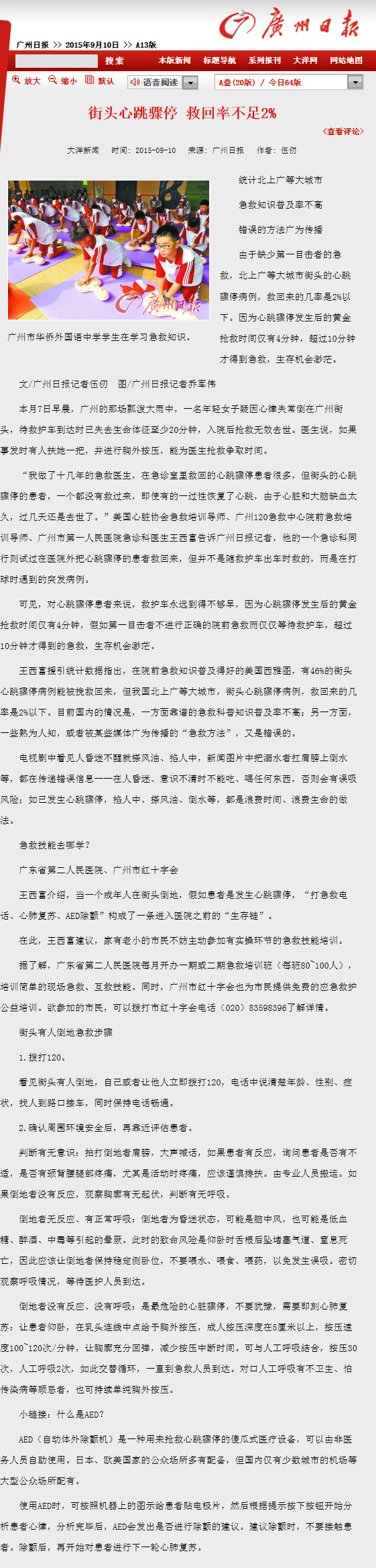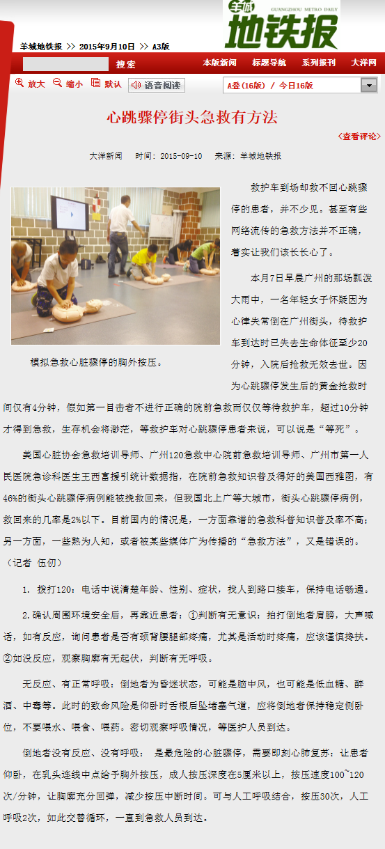 《广州日报》:街头心跳骤停 救回率不足2% 2015年9月10日A13版