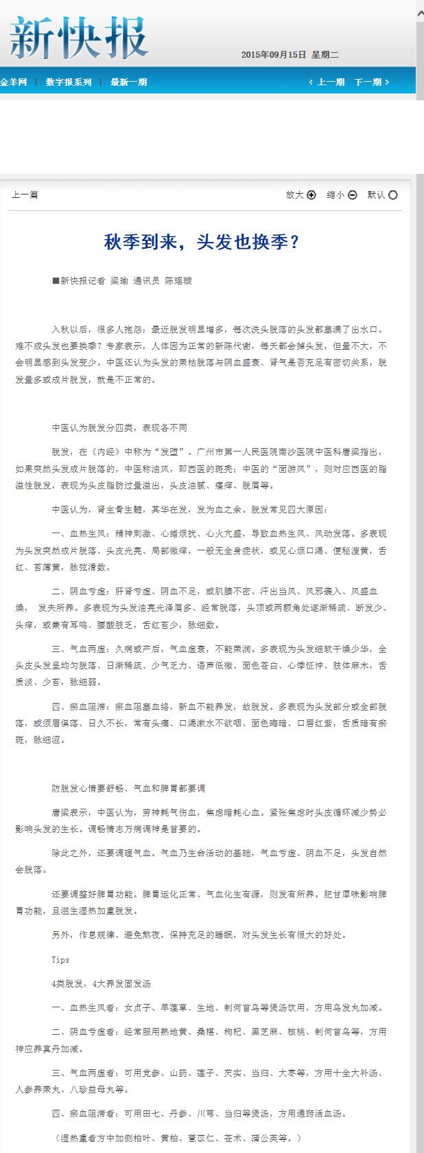 《新快报》:秋季到来,头发也换季? 2015年9月15日B07版
