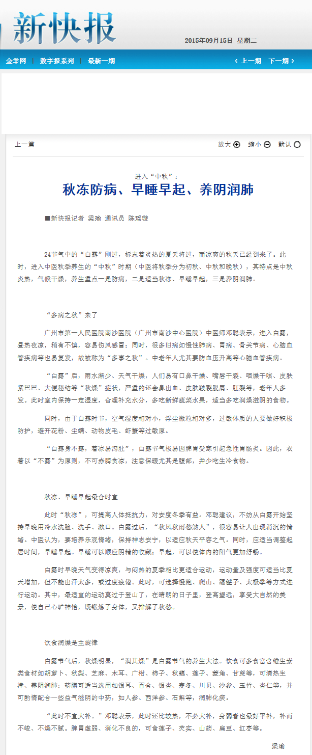 《新快报》:进入中秋:秋冻防病、早睡早起、养阴润肺 2015年9月15日B04版