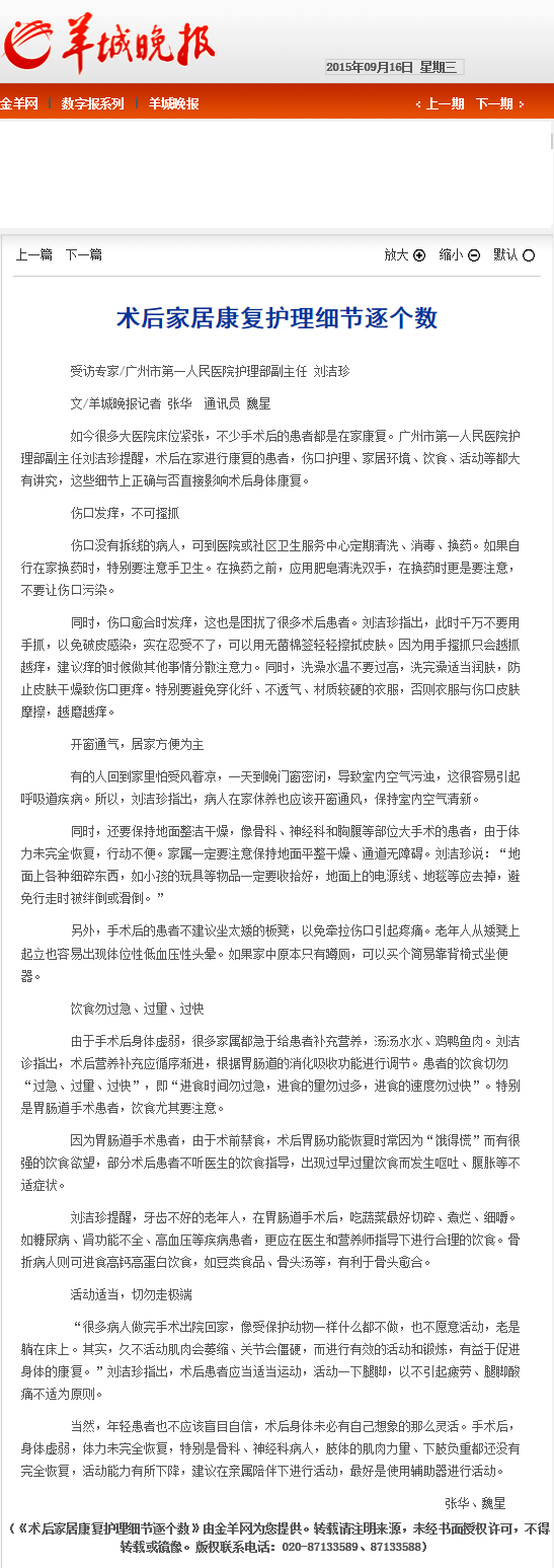 《羊城晚报》:术后家居康复护理细节逐个数 2015年9月16日A20版