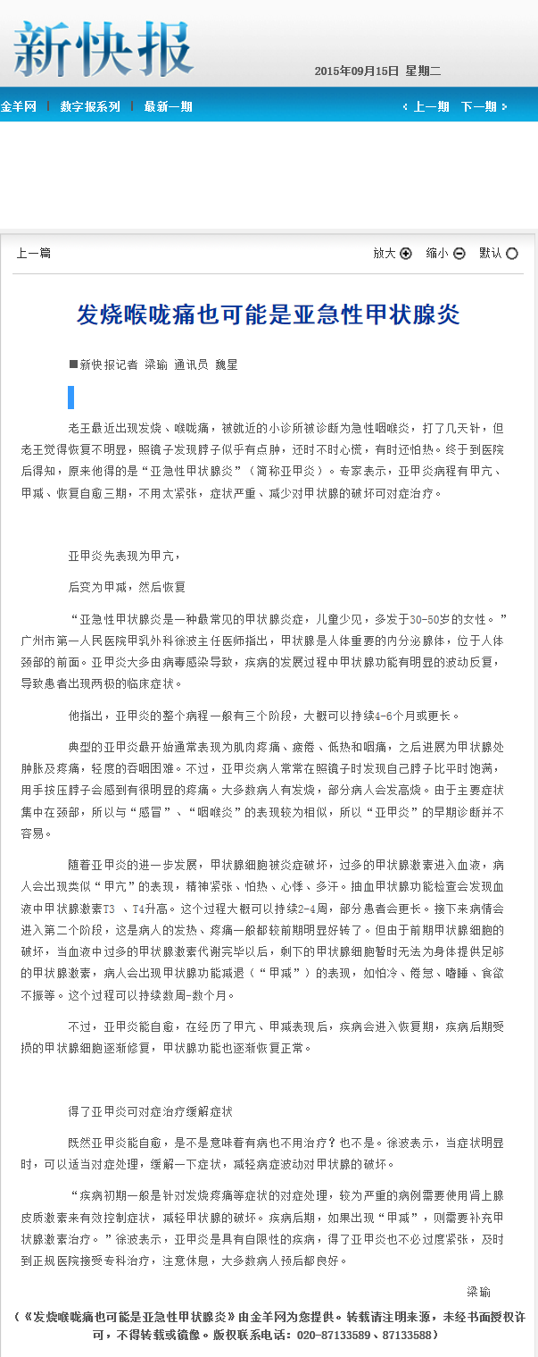 《新快报》:发烧喉咙痛也可能是亚急性甲状腺炎 2015年9月15日B03版
