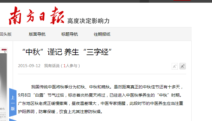 《南方日报》:“中秋”谨记 养生“三字经” 2015年9月12日B07版