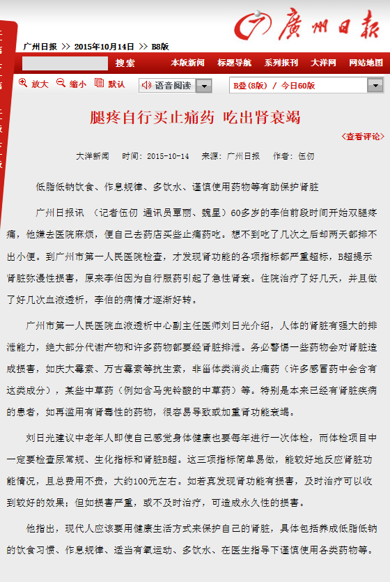 《广州日报》:腿疼自行买止痛药 吃出肾衰竭 2015年10月14日B08版