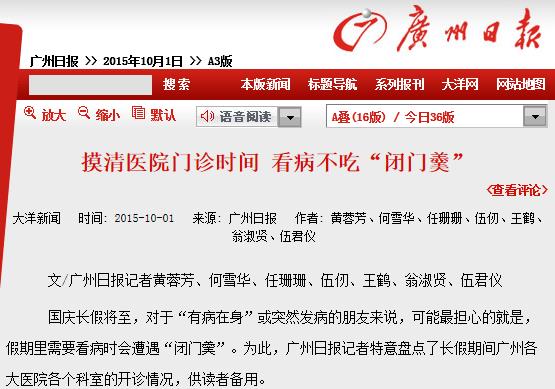 《广州日报》:摸清医院门诊时间 看病不吃“闭门羹” 2015年10月1日A03版