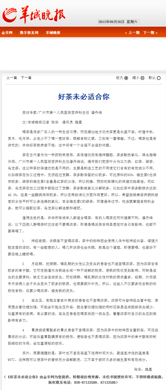 《羊城晚报》:好茶未必适合你 2015年9月26日B06版