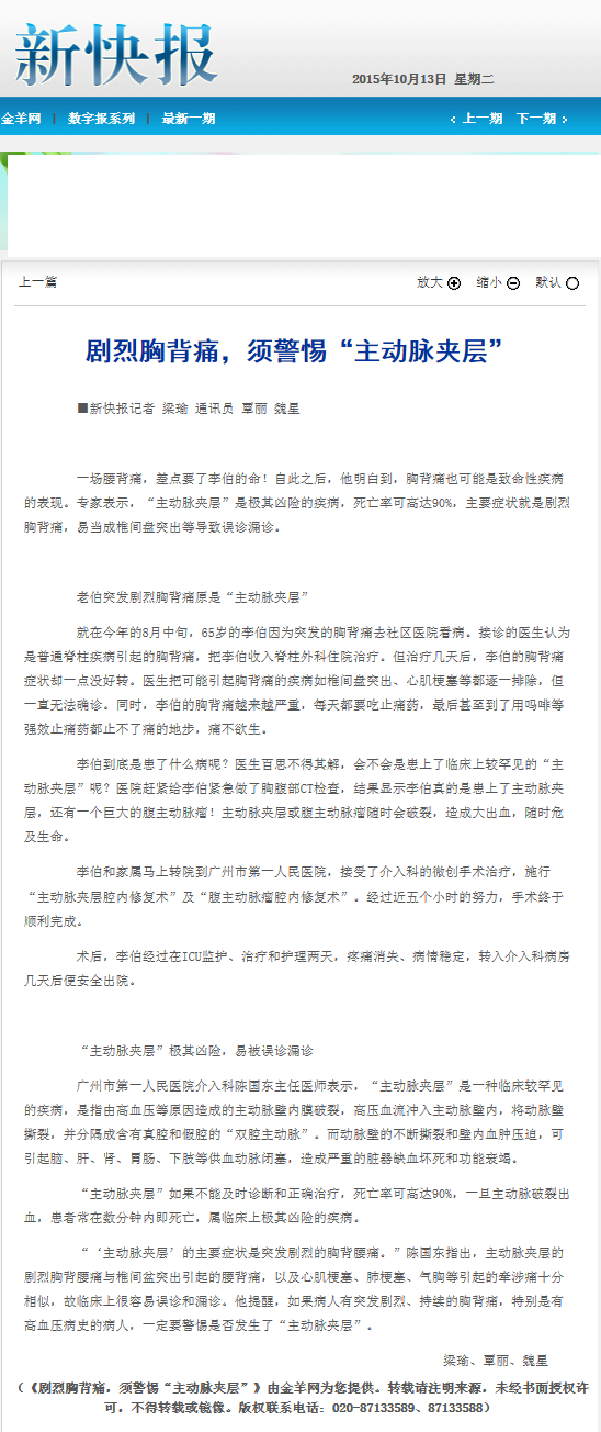 《新快报》:剧烈胸背痛,须警惕“主动脉夹层” 2015年10月13日B13版