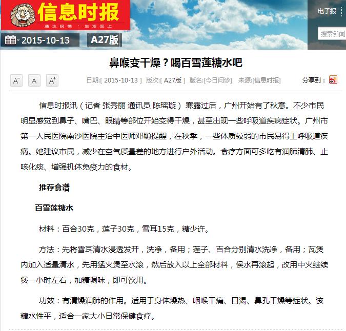 《信息时报》:鼻喉变干燥?喝百雪莲糖水吧 2015年10月13日A27版