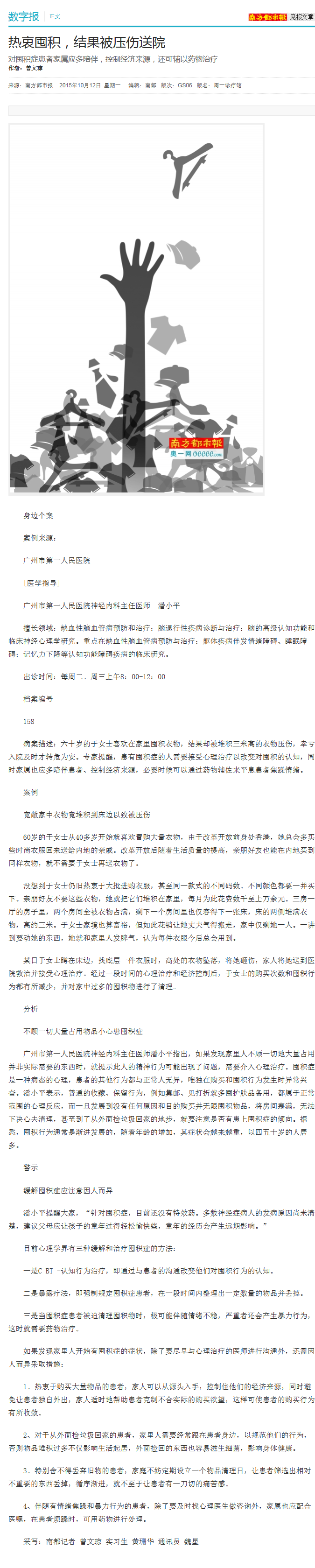《南方都市报》:热衷囤积,结果被压伤送医院 2015年10月12日GS06版