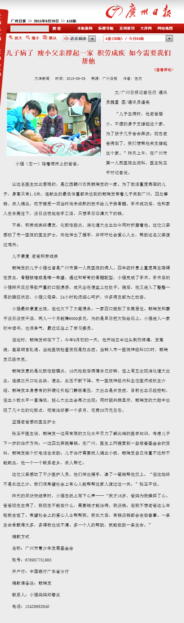 《广州日报》:儿子病了 瘦小父亲撑起一家 积劳成疾 如今需要我们帮他 2015年9月29日A18版