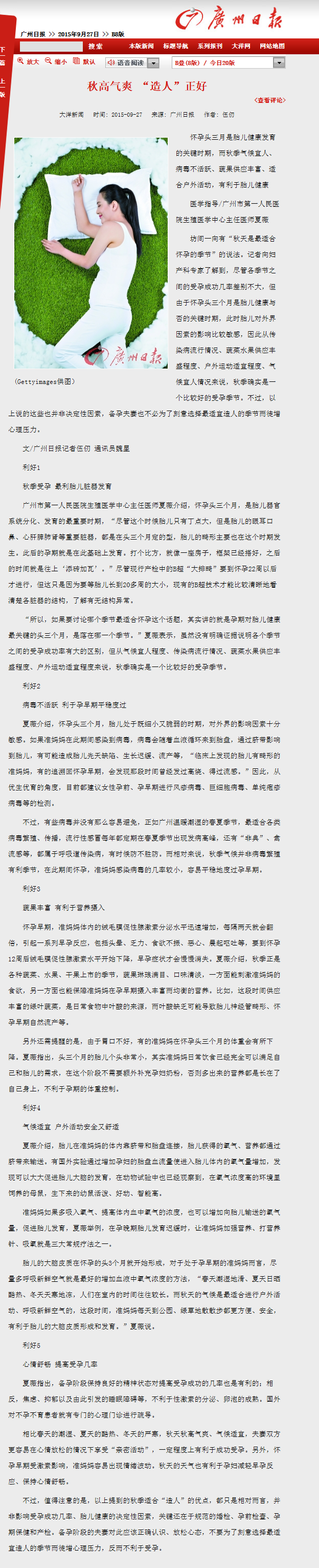 《广州日报》:秋高气爽 “造人”正好 2015年9月27日B08版