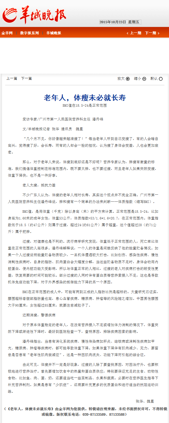 《羊城晚报》:老年人,体瘦未必就长寿 2015年10月23日A18A版