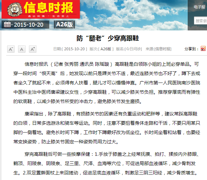 《信息时报》:防“腿老”少穿高跟鞋 2015年10月20日A26版