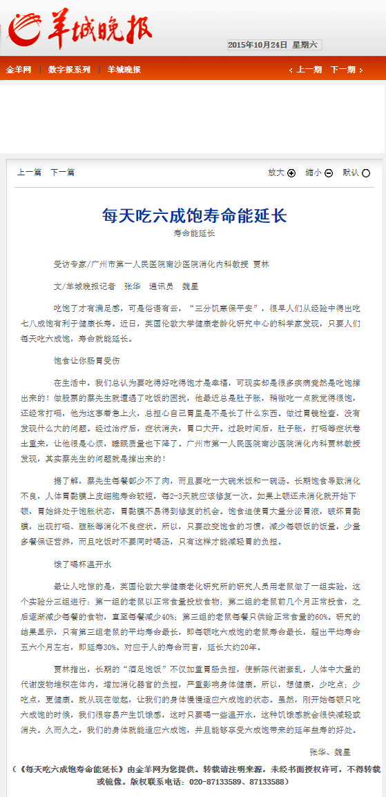 《羊城晚报》:每天吃六成饱寿命能延长 2015年10月24日B08版