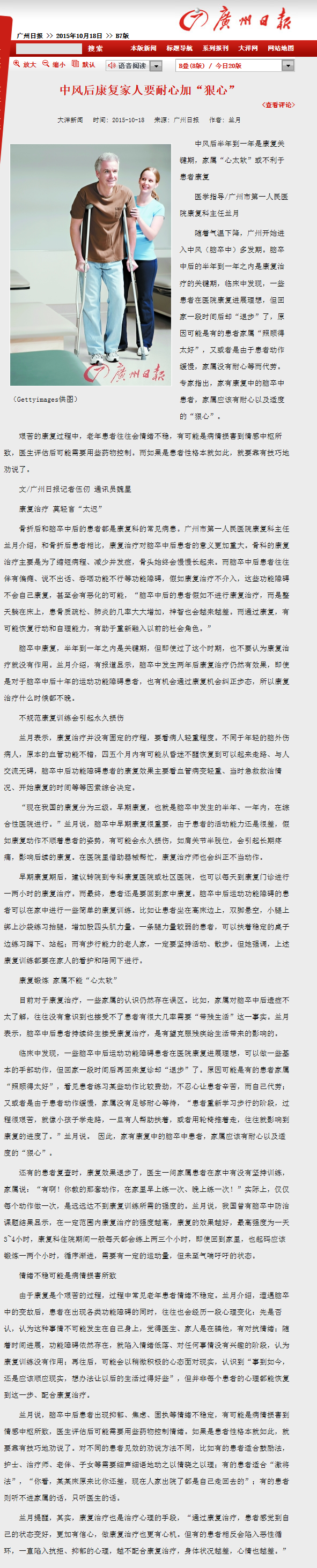 《广州日报》:中风后康复家人要耐心加“狠心” 2015年10月18日B07版