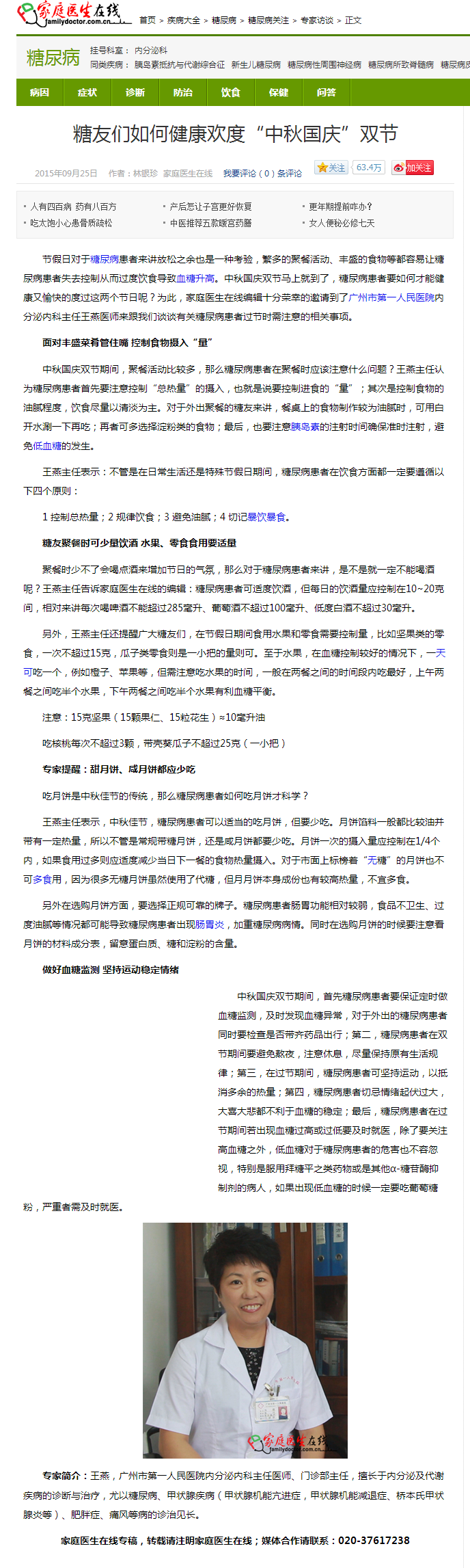 【家庭医生在线】糖友们如何健康欢度“中秋国庆”双节 2015年9月25日新闻