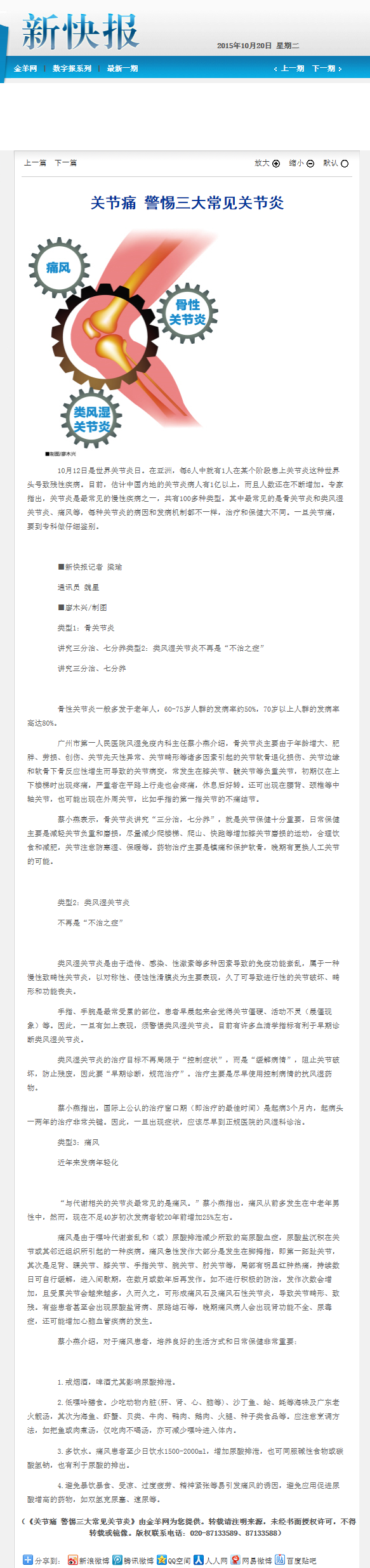 《新快报》:关节痛 警惕三大常见关节炎 2015年10月20日B08版
