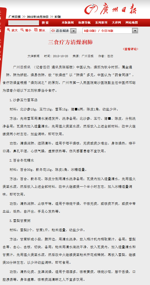 《广州日报》:三食疗方清燥润肺 2015年10月20日B07版