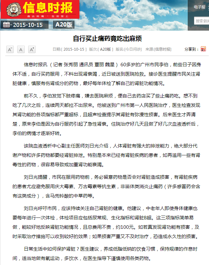 《信息时报》:自行买止痛药竟吃出麻烦 2015年10月15日A20版