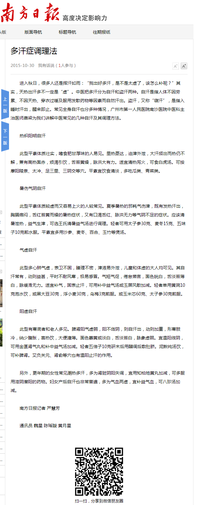 《南方日报》:多汗症调理法 2015年10月30日A29版