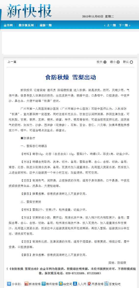 《新快报》:食防秋燥 雪梨出动 2015年11月3日B10版