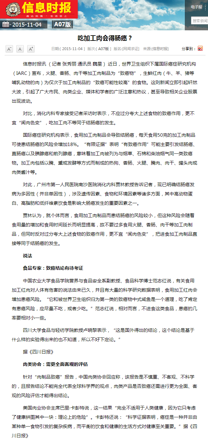 《信息时报》:吃加工肉会得肠癌? 2015年11月4日A07版