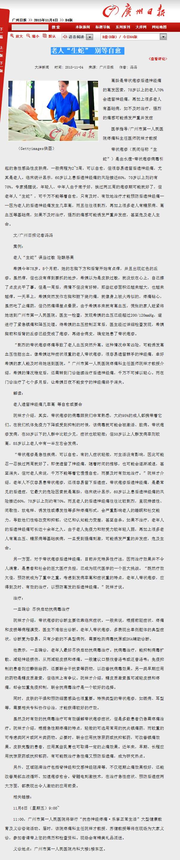 《广州日报》:老人“生蛇” 别等自愈 2015年11月4日B04版