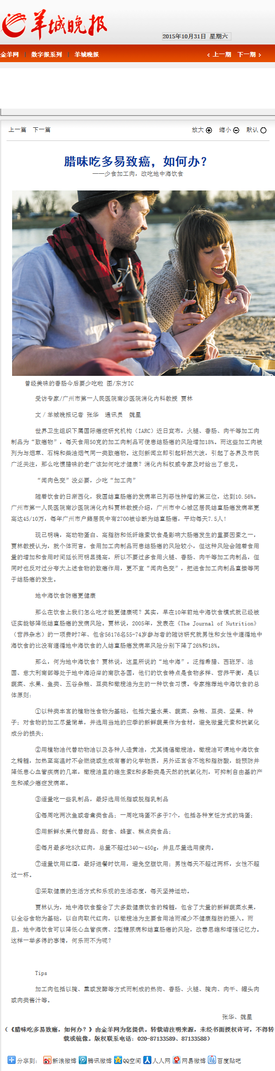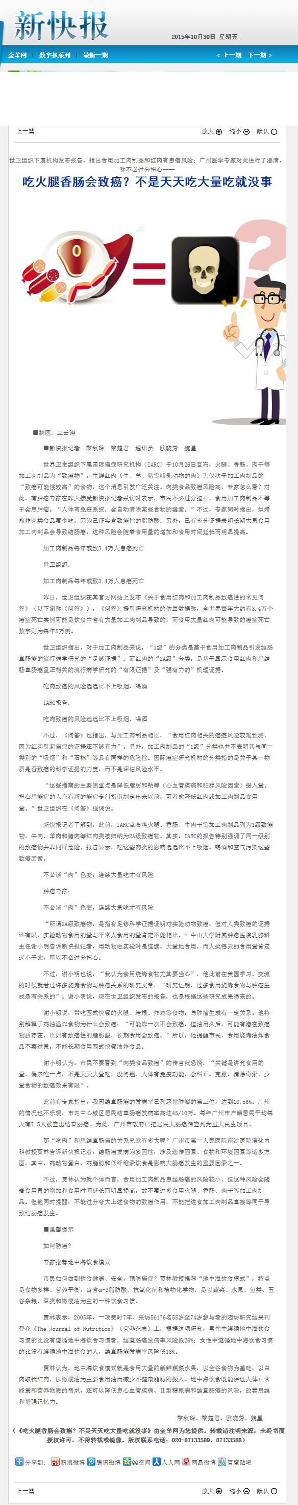 《新快报》:吃火腿香肠会致癌?不是天天吃大量吃就没事 2015年10月30日