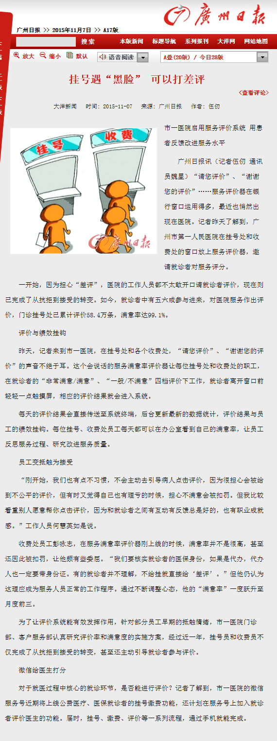 《广州日报》:挂号遇“黑脸” 可以打差评 2015年11月7日A17版