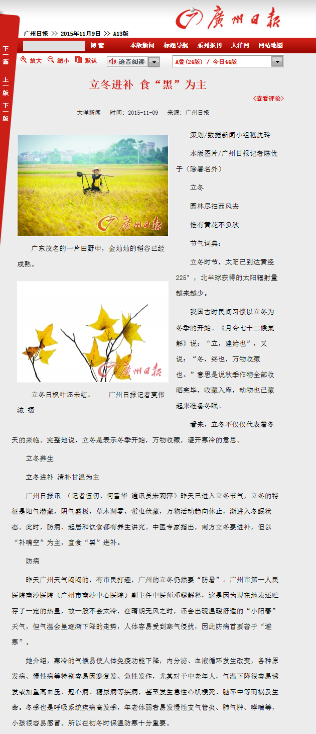 《广州日报》:立冬进补 食“黑”为主 2015年11月9日A13版