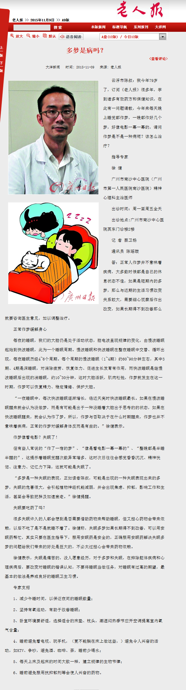 《老人报》:多梦是病吗? 2015年11月9日A09版