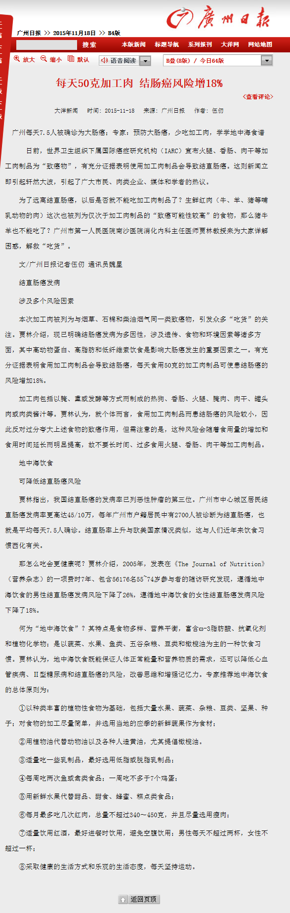 《广州日报》:每天50克加工肉 结肠癌风险增18% 2015年11月18日B04版
