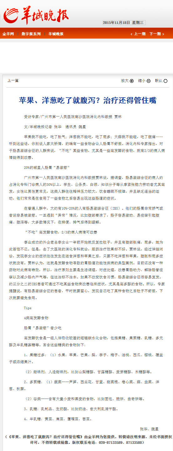 《羊城晚报》:苹果、洋葱吃了就腹泻?治疗还得管住嘴 2015年11月18日A20版
