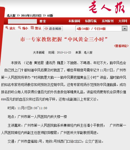 《老人报》:市一专家教您把握“中风黄金三小时” 2015年11月23日A2版