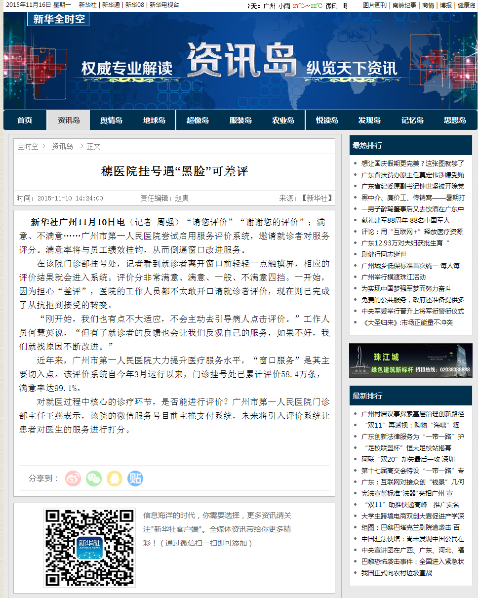 【新华社】新华全时空:穗医院挂号遇“黑脸”可差评 2015年11月10日