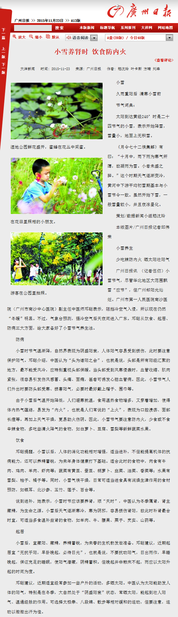 《广州日报》:小雪养肾时 饮食防内火 2015年11月23日A13版
