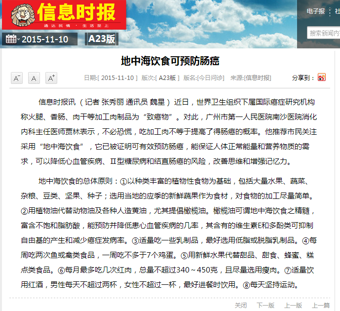 《信息时报》:地中海饮食可预防肠癌 2015年11月10日A23版