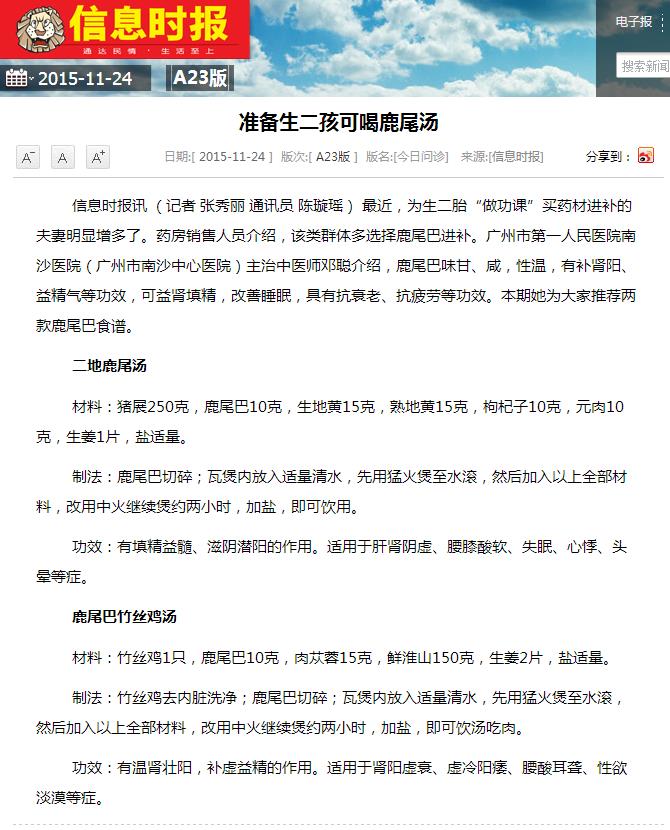 《信息时报》:准备生二孩可喝鹿尾汤 2015年11月24日A23版