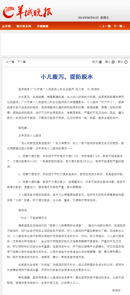 《羊城晚报》:小儿腹泻,提放脱水 2014年8月1日B07版