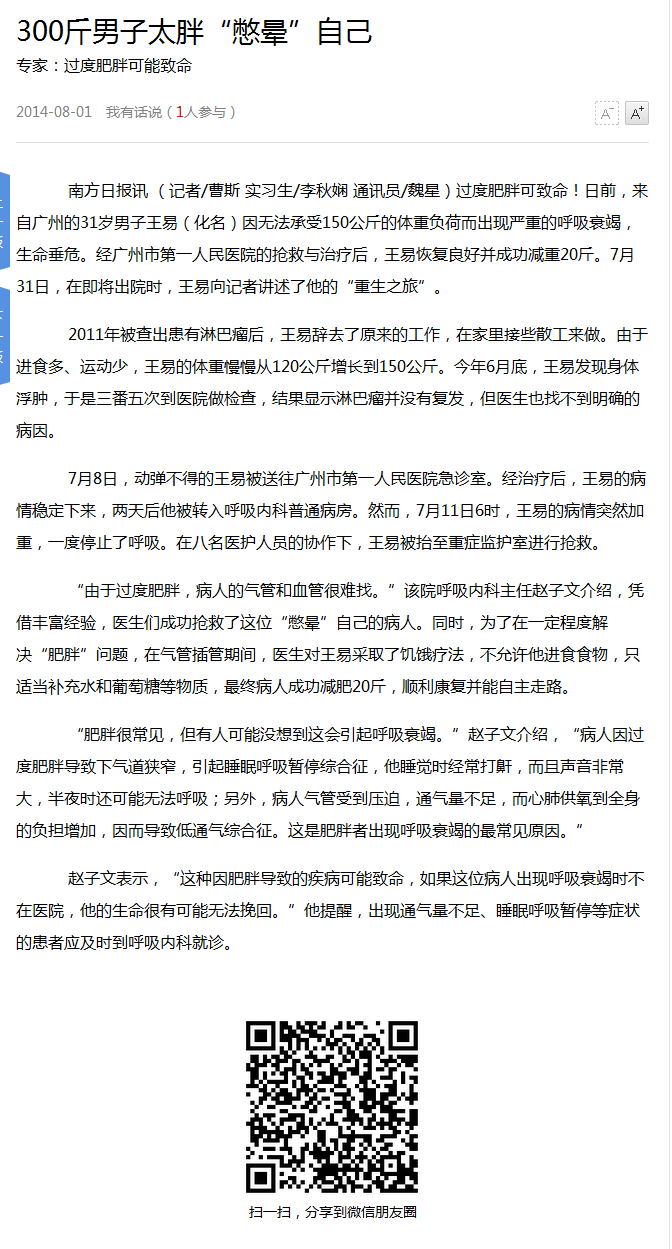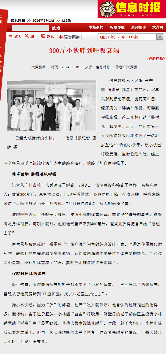 《信息时报》:300斤小伙胖到呼吸衰竭 2014年8月1日A15版